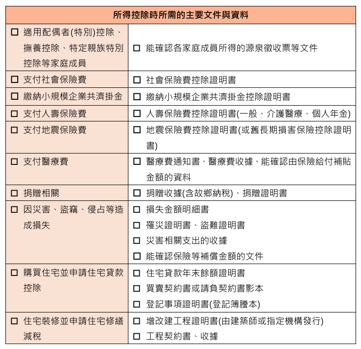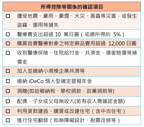 在辦理所得稅確定申告時,請參考下列檢查清單,確認計算所得及適用各項所得控除所需的主要書類。若要申請醫療費控除、個人自費醫療稅制(與醫療費控除擇一適用)、捐贈控除(包括故鄉納稅)、因災害、盜竊或遺失造成損失的雜損控除,或利用住宅貸款購置或改建房屋時的住宅貸款控除等,皆需進行確定申告。